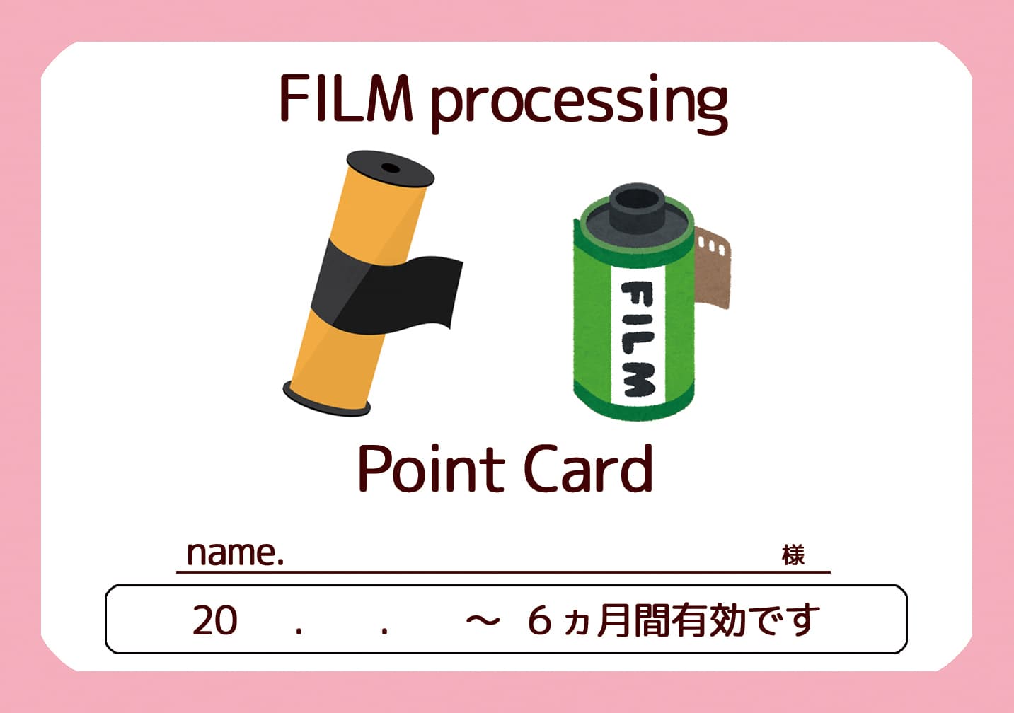 フィルム現像のスタンプカードを用意しています。フィルム現像1本毎にスタンプを1つ。スタンプが5つ貯まったら、次回1本分の現像料金をサービス致します。結構お得なので、ぜひ貯めてみてください!スタンプカードが欲しい方は、お声掛けください。